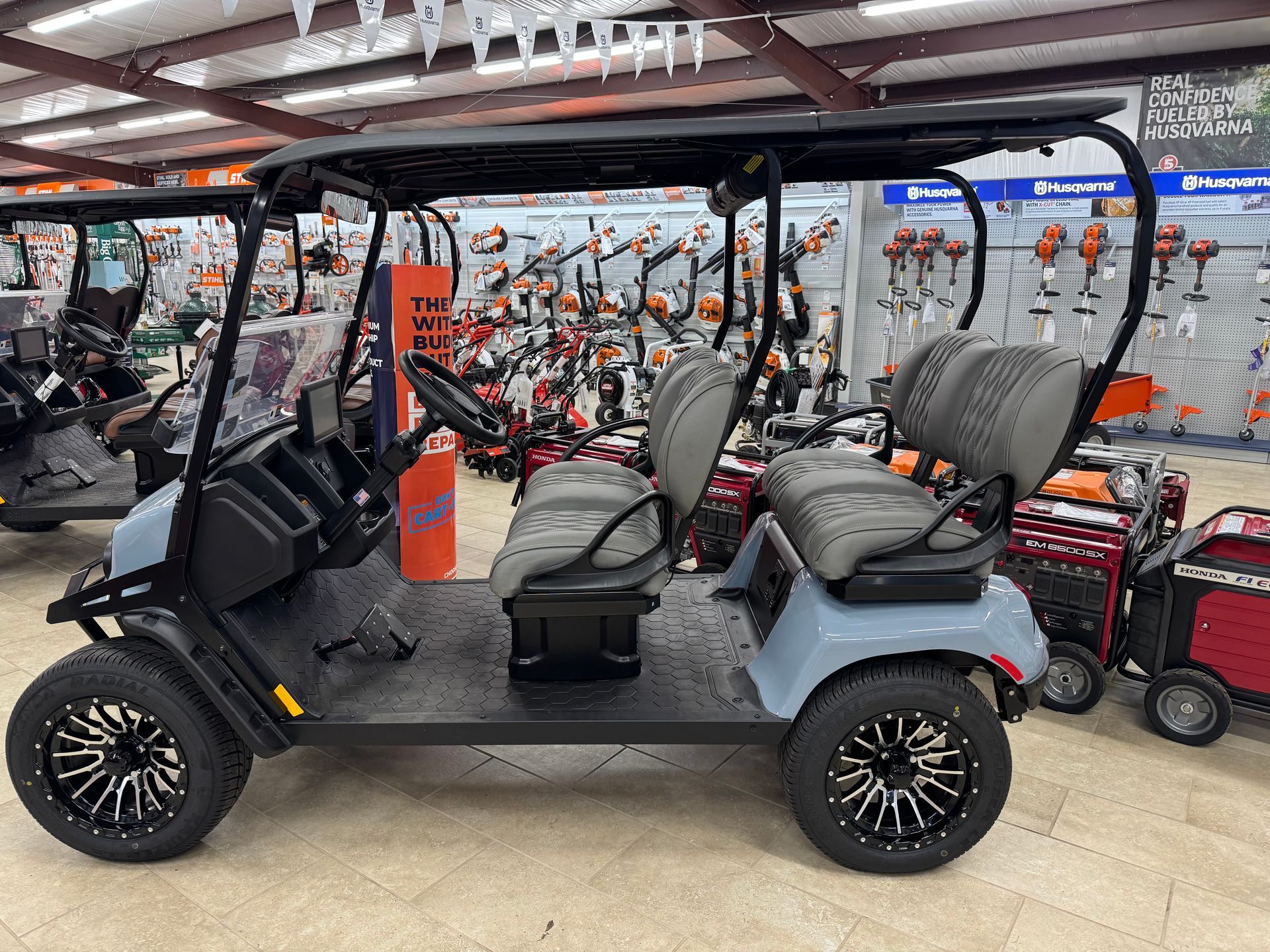 LIGHTED CUPHOLDER, INDIVIDUAL KEY SWITCH, USB A&C. ECOXGEAR 10" TOUCHSCREEN WITH BLUETOOTH CONNECTIVITY, 28" SOUNDEXTREME ELITE SOUNDBAR BY ECOXGEAR AND REARVIEW CAMERA. PREMIUM RGB HEADLIGHTS, TAIL LIGHT AND BRAKE LIGHT. BRUSHGUARD, FENDER FLARES, TURN SIGNALS WITH HORN, BLACK LOGOS & EMBLEMS. 2" HITCH RECEIVER WITH QUIET CONNECTION. LITHIUM BATTERY & CHARGER.